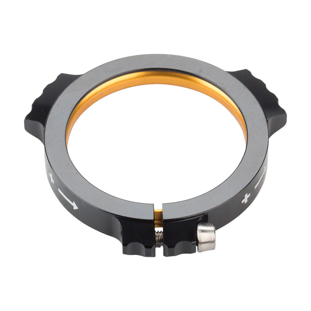With the conception of our Cane Creek eeWings Titanium crank set we cut no corners, and our CNC-machined preload assembly is no exception. the Cane Creek Spindle Preload Assembly is equip with a black aluminum spacer preload ring, a gold aluminum thread ring, and a titanium 2.5mm hex fastening bolt. We are so proud of this piece of jewelry that we decided to design it to fit onto other 30mm crank spindles from SRAM and Raceface. Loose the plastic preload on your crankset, add piece of mind.